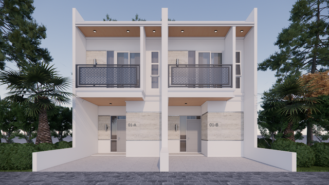 Design dengan 2 Lantai, 3 Kamar Tidur, 2 Kamar Mandi. 1 Carport.